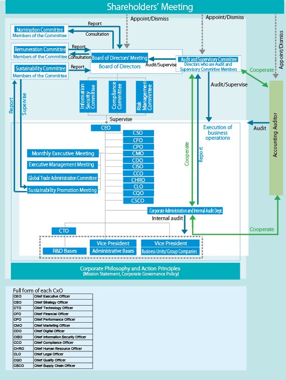 The Audit and Supervisory Committee audits directors’ execution of business and receives reports from accounting auditors.