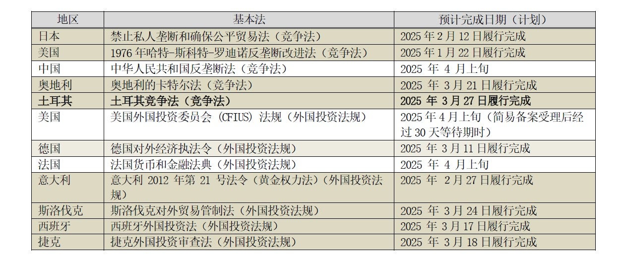 今后,在其他地区一旦完成实施本交易所需的基于竞争法和外国投资法规的必要手续时,我们将及时公布。