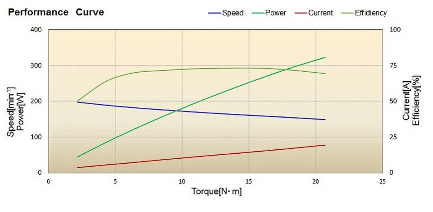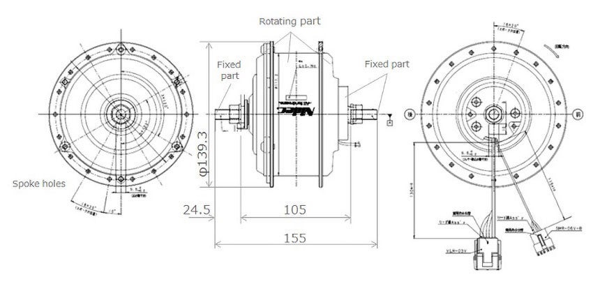 此马达可安装在轮子中,用于电动助力自行车。附带减速器,以低齿形力矩,高输出扭矩为特点。