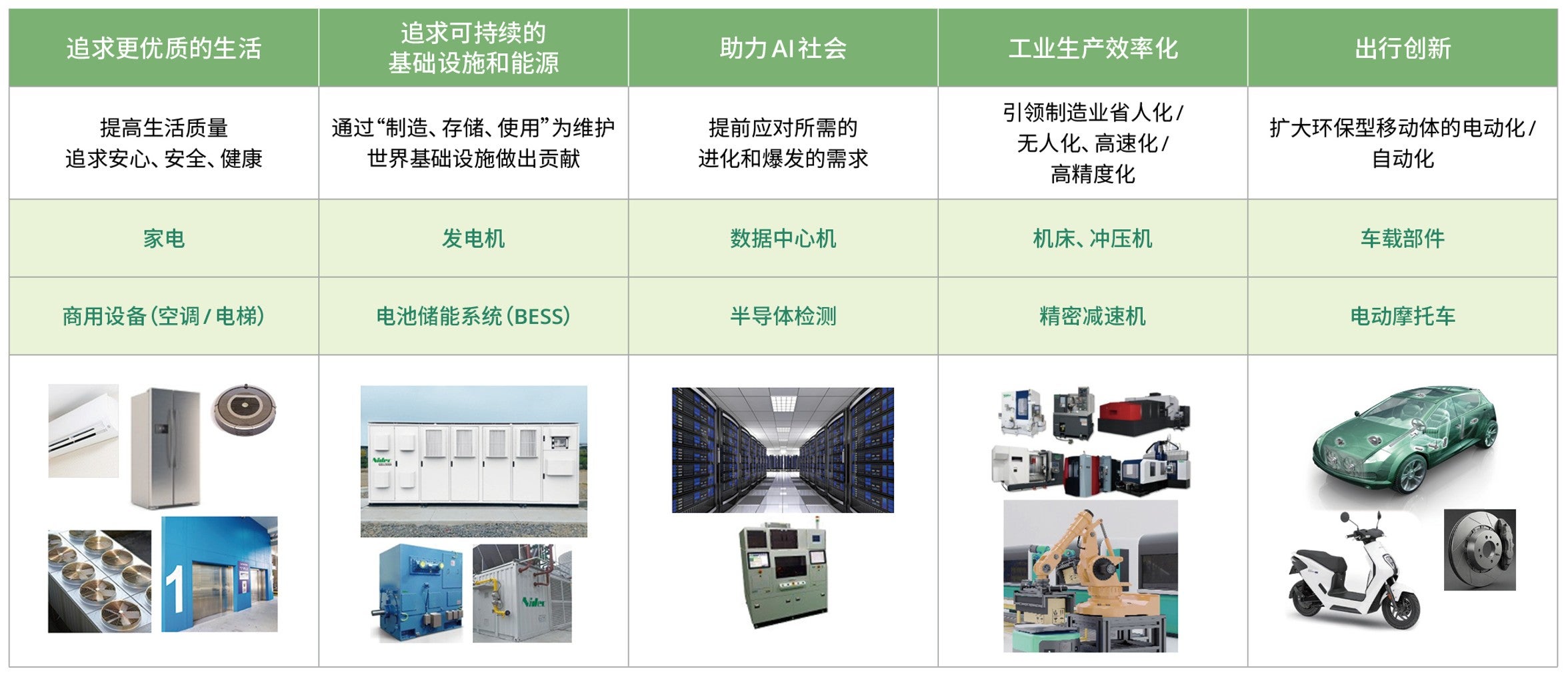 为了实现清洁能源不间断循环的可持续发展的循环型社会,NIDEC集团有五大支柱业务领域。从集成尖端技术的AI相关领域,到根植于日常生活的家电领域,乃至大规模的社会基础设施和移动出行领域,我们将这五大业务视为“重点业务领域”,并致力于业务规模的不断扩大。