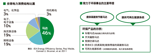 据称,电机耗电量约占全球发电总量的一半之多。现在,该类高能耗电机中有一半以上是交流电机或有刷直流电机等能源效率较低的电机。本公司通过追求高效率、高性能的电机以及能体现出NIDEC集团制造优势的产品的“轻、薄、短、小”,开发并提供能削减耗电量、削减使用材料等有利于降低社会环境负荷的产品和解决方案。此外,我们还提供支撑可再生能源普及的解决方案,为全球的节能及脱碳化做出贡献。