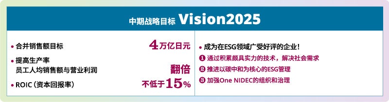 在2021年7月公布的新中期战略目标“Vision 2025”中,我们新纳入了ESG相关项目作为目标,NIDEC(尼得科)在中长期内履行“以全球首屈一指的高性能电机为地球做贡献”的使命,不断扩大企业价值的基础上,特定了应优先应对的重要课题(materiality)。将按照特定的重要课题相对应的活动主题设定的KPI纳入新中期战略目标“Vision2025并予以推进,以此来提高本公司在经营方面的可持续性。