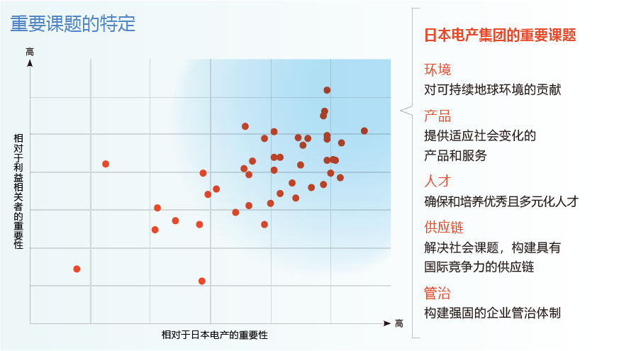 管理层根据STEP 2、3得出的结果反复讨论并从相对于利益相关者的重要性和相对于NIDEC(尼得科)的重要性中选取应优先应对的课题。并通过董事会上的审议,将提取出的优先课题最终锁定为5项重要课题、15个活动主题。