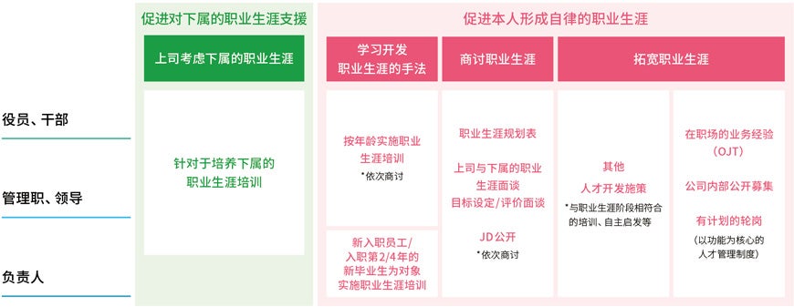 在职业生涯开发支援方面,通过“面向上司和年轻人的职业生涯培训”以及“职业生涯计划表的充分运用”,从职业生涯的盘点和回顾等方面,为描绘未来的职业愿景,进行开发支援。