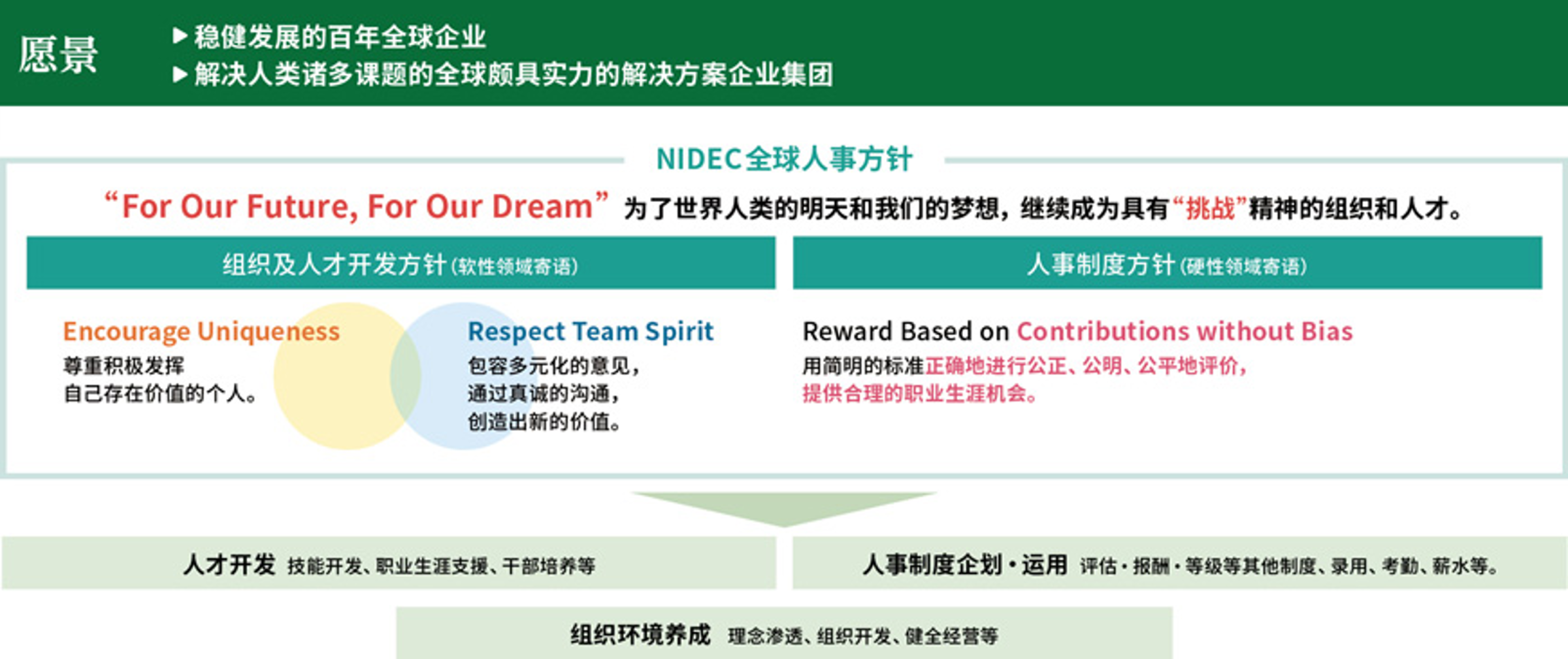 正如NIDEC全球人事方针中的公司组织及人才相关的基本思想“‘For Our Future, For Our