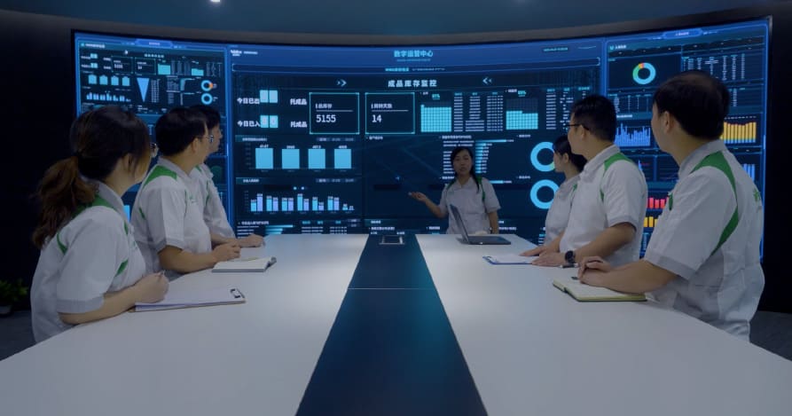 与生产现场配套设立的数字化运营中心(Digital Operation Center),可实时统筹工厂全域数据,涵盖生产进度、财务状况、PSI 计划及人力资源等信息。整面大屏实时可视化呈现最新数据,经营管理层每日在此对风险与课题开展快速研讨并及时决策。这里是打通生产现场与经营管理层、实现高速化经营决策的核心枢纽。