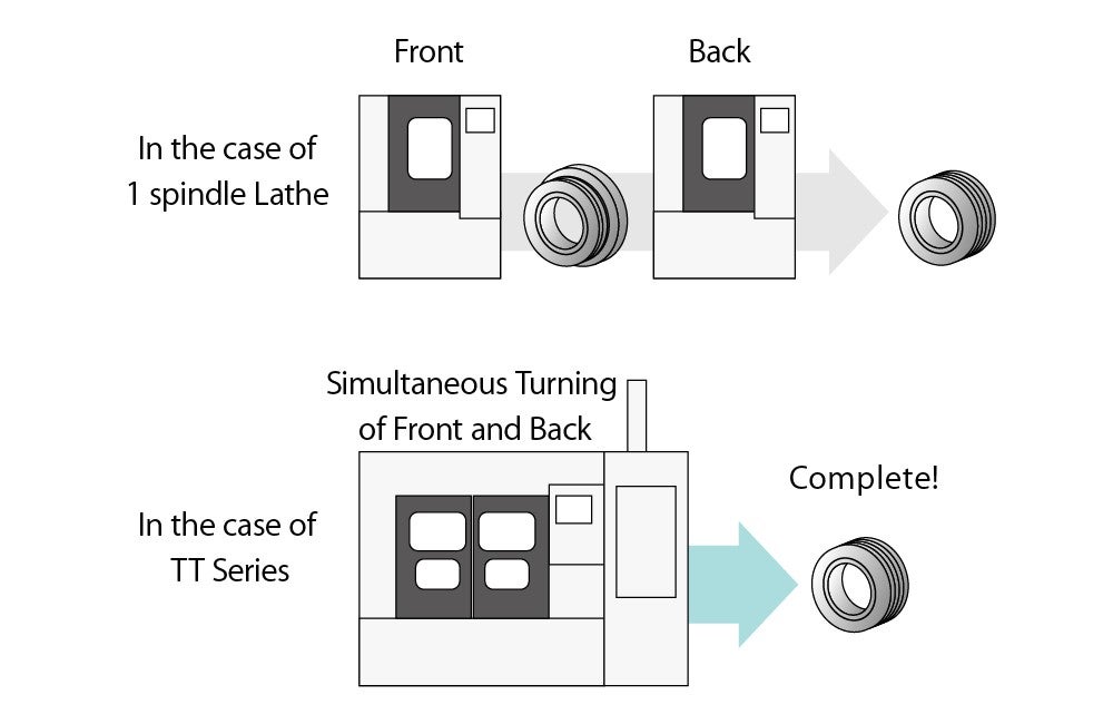 Turning that requires two single-spindle lathes can be completed with a single machine, reducing cycle time and floor space.