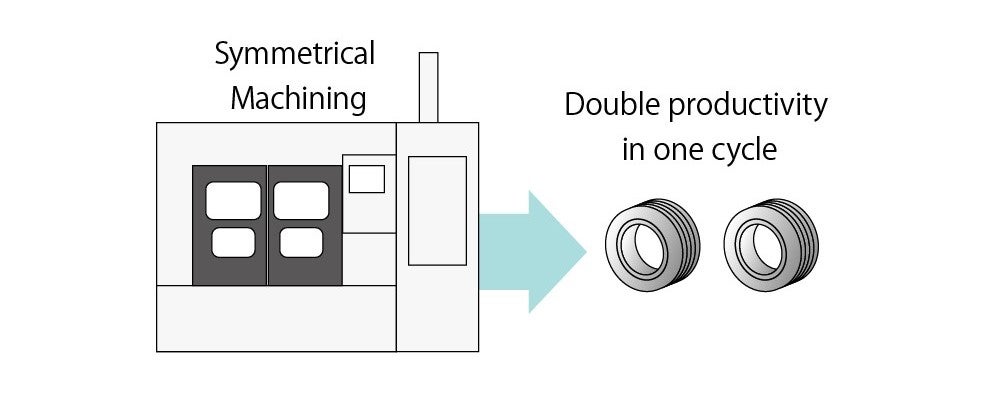 The cycle time is reduced by half by performing the same machining on both the left and right spindles.
