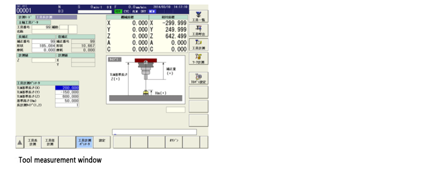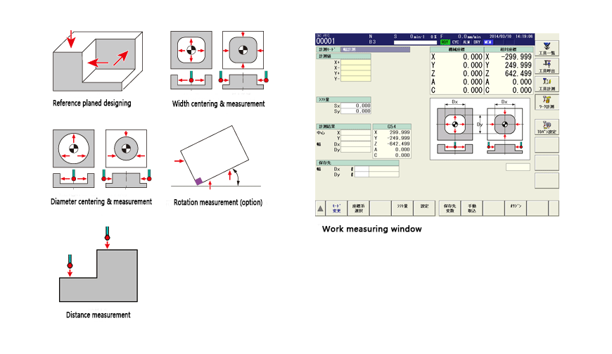 The user can operate the hand wheel to move the sensor to the point of measurement. Touch the work, and the machine will measure it automatically. To set measurement results, simply perform a one-touch operation to set the work's coordinate and tool correction number.