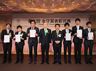 The awards ceremony began with Dr. Hori, the Review Committee’s Chairman, explaining how the winners were selected, and the winners of the Grand Nagamori Award, as well as the Special Award, which went to Dr. Masato Sagawa, President of NDFEB Corporation, were announced. All the winners were presented with certificates of commendation and trophies by Mr. Nagamori, the president of the foundation. This was followed by joyful speeches by Dr. Fujimoto and Dr. Sagawa on behalf of all the winners. Dr. Fujimoto, the winner of the Grand Nagamori Award, was presented with an extra prize of 5 million yen, the winners of Nagamori Awards, 1 million yen, and Dr. Sagawa, the winner of the Special Award, 500,000 yen.