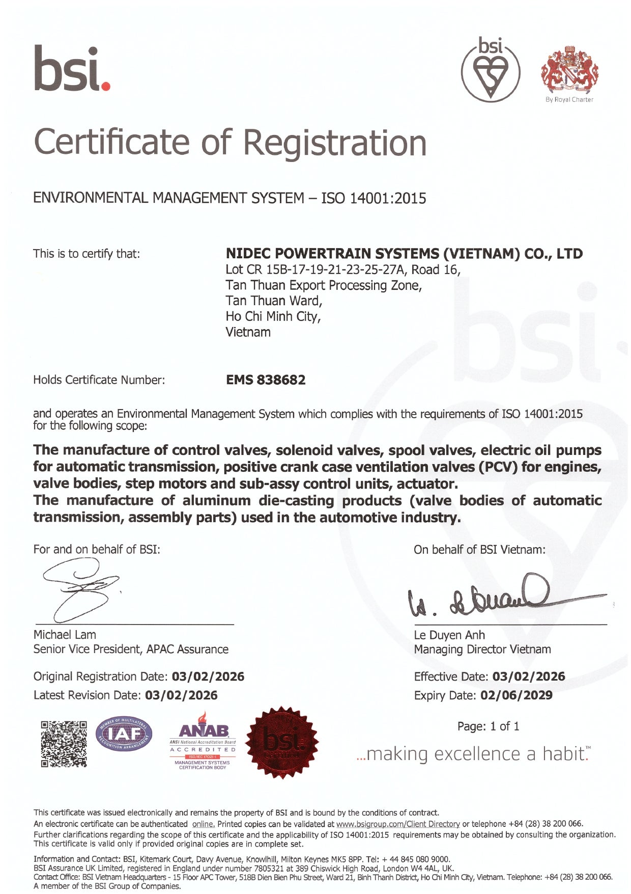 NIDEC POWERTRAIN SYSTEMS has been certified for three management systems: ISO14001:2015, IATF16949 and ISO27001 in recognition of its efforts to improve quality, environment, and information security.