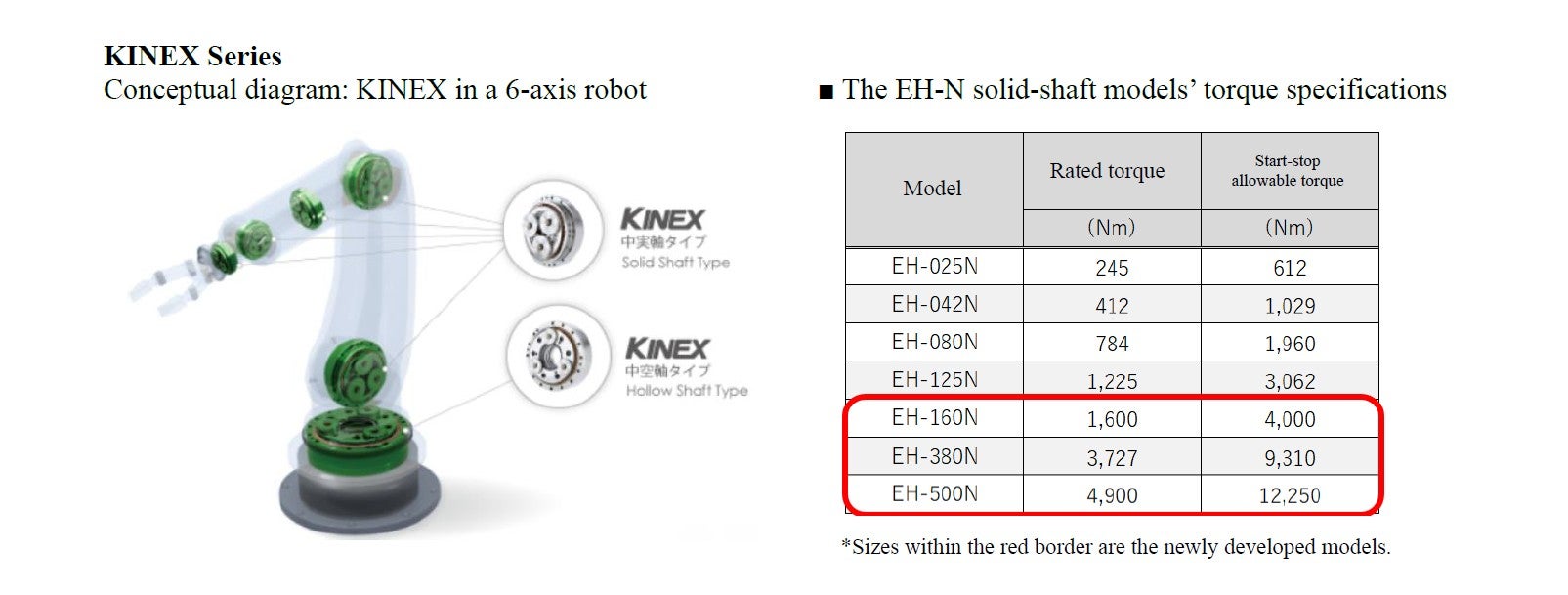 Nidec Drive Technology Corporation (“Nidec Drive Technology” or the “Company”) announced today that it has developed three new models compatible with large robots to be part of the solid-shaft type (EH-N) of the Company’s precise-control gearboxes, the KINEX series.