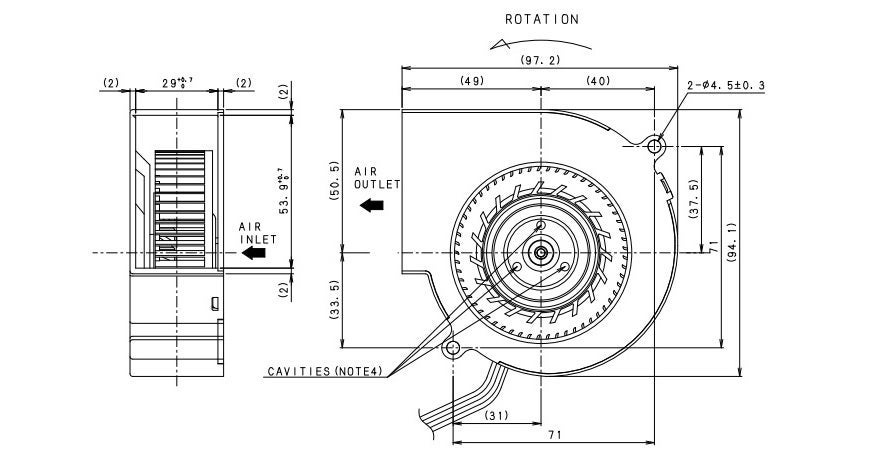 - Sirocco Fan Motor whose air inletting direction is vertical to its outletting direction.