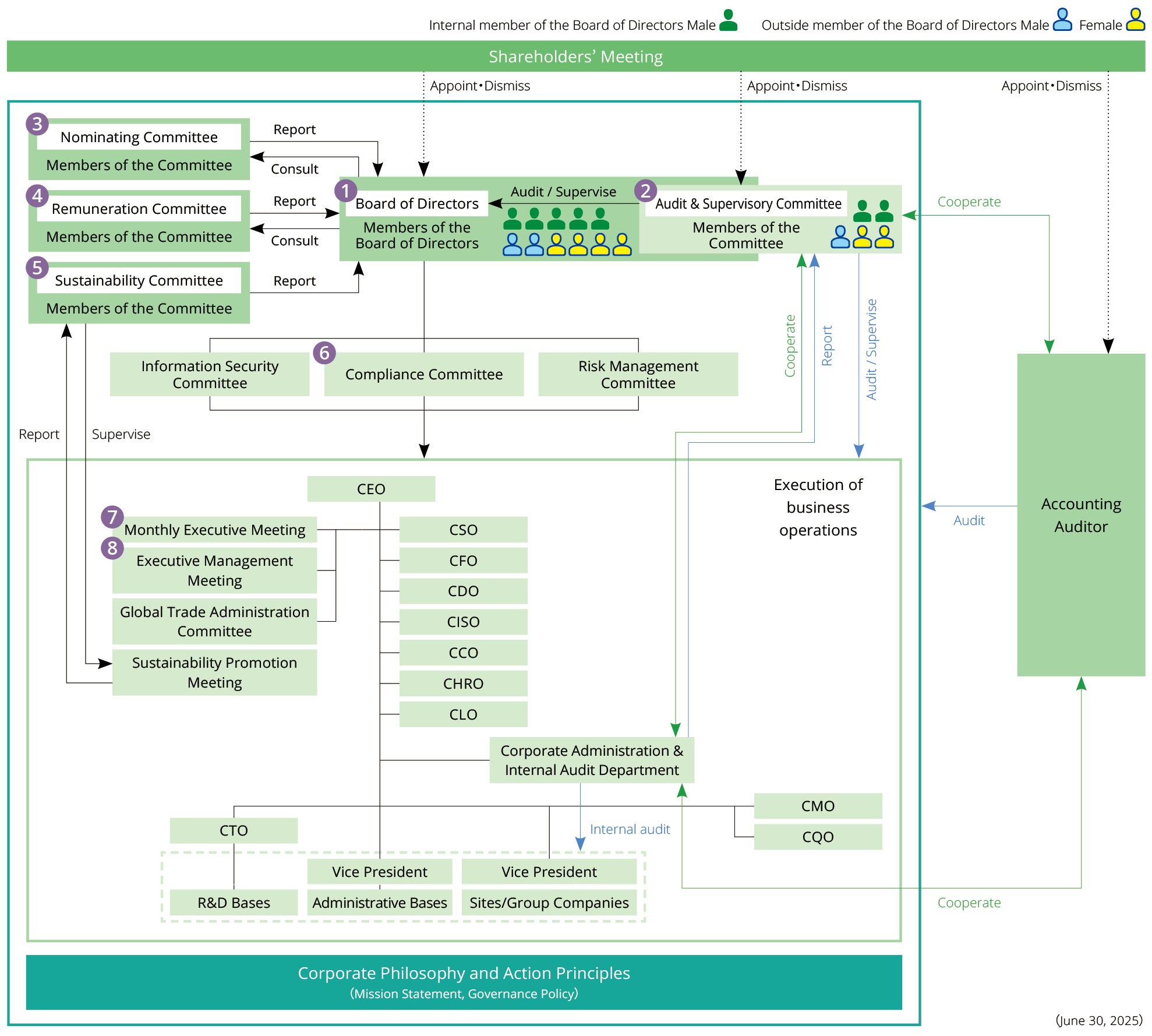 The Board of Directors makes material management decisions and oversees the Group’s business operations as a whole. The Board of Directors includes highly independent Outside Members, to enhance the supervisory function of the company’s business operation and improve management transparency and objectivity. Pursuant to the resolution passed at the Shareholders’ Meeting in June 2025, the Board of Directors consists of 11 directors, 7 of whom are outside directors.
