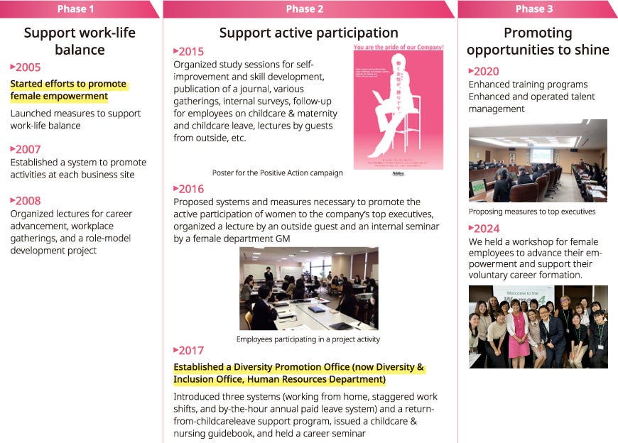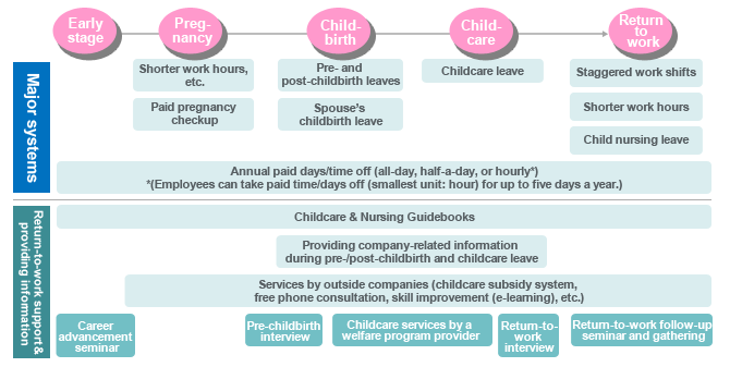 | A Return-to-Work Support Program | Nidec introduced a return-to-work support program (by setting up a point of contact to support a female employee throughout her pregnancy until she returns to work, and another point of contact to help a female employee to return to work). In addition, the company interviews a female employee before she returns to work to see the style she wishes to work with to ensure a smooth return to work. |