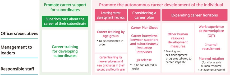 In career development, we utilize such occasions and tools as career seminars for managerial and young employees and the career planning sheet to help them check and look back their careers, and envision