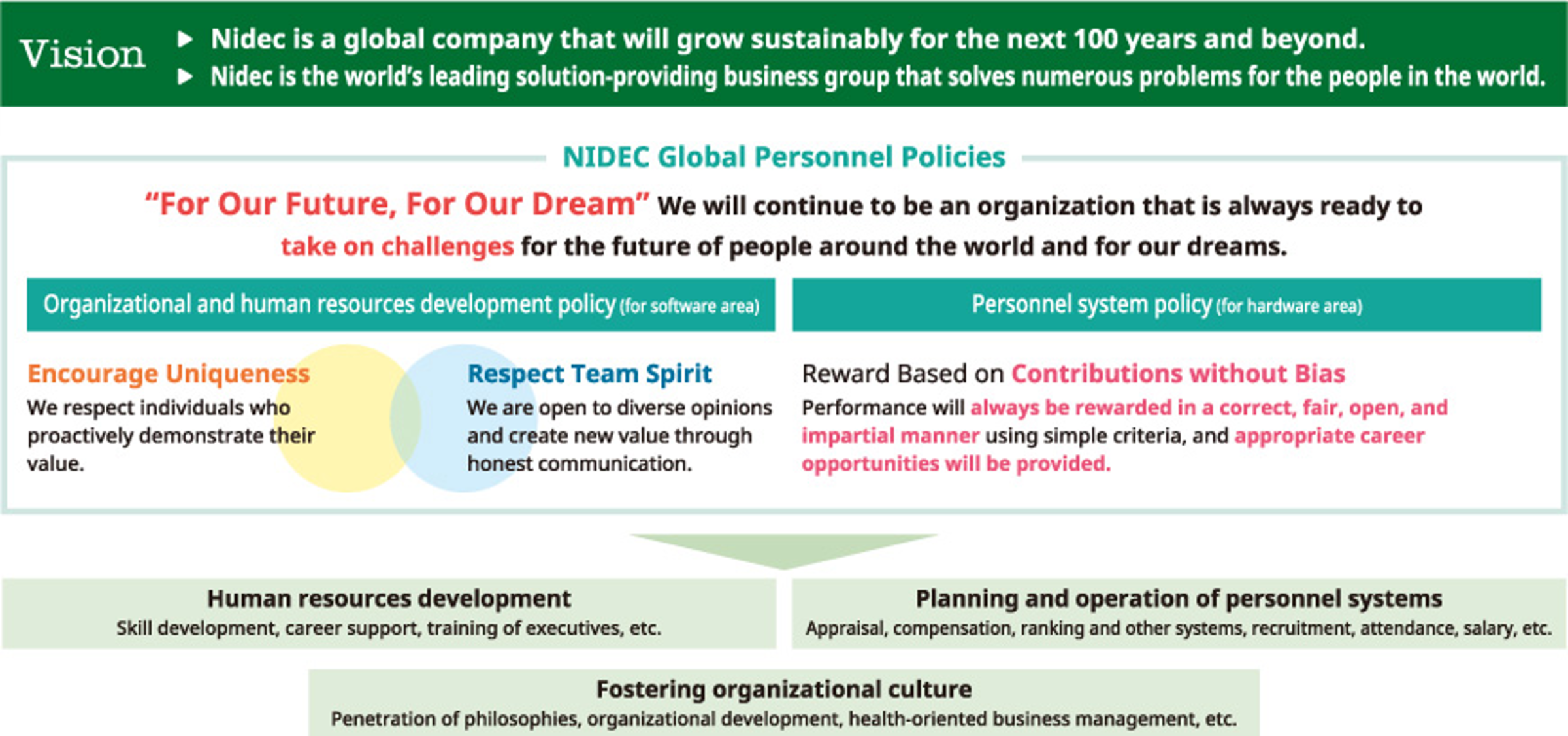 The basic notion on corporate organizations and human resources in the Nidec Global Personnel Policy states, “We stay committed to maintaining an organization and group of human resources that constantly
