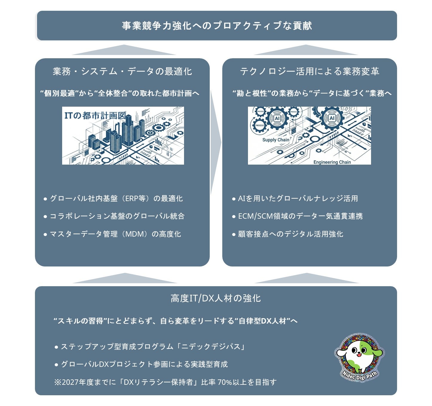 これまで各事業、拠点を中心として、社内基盤やデータの最適化を推進してきました。これらをグローバル視点で「全体最適」へと昇華させることが、さらなる競争力の源泉になると考えています。その指針となる「ニデック流Enterprise Architecture(都市計画図)」を整備し、着実なアップデートに取り組んでいく方針です。