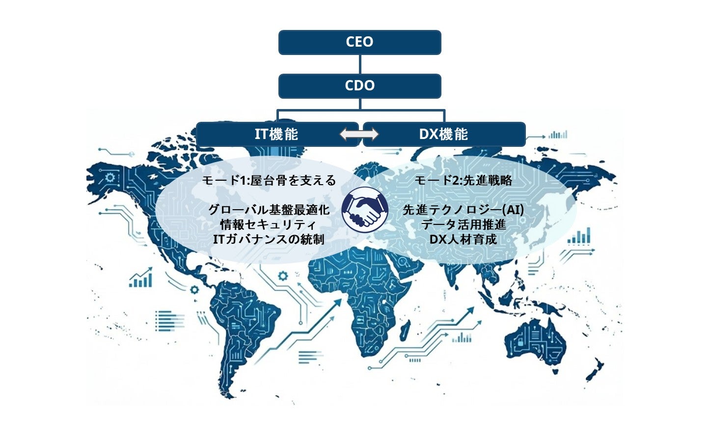 CEO直轄のCDO(最高デジタル責任者)のもと、「IT機能」と「DX機能」を高度に連携させたバイモーダル組織体制で推進します。安定的なITガバナンスの維持と、先進テクノロジーの機敏な実装を同期させ、グループ・グローバル全社の変革を強力に牽引します。