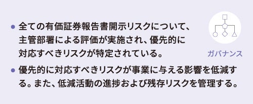 Plan、事業継続計画)の整備状況を定期的に確認し、リスク低減に向けた継続的な改善活動の定着を図ります。2024年度には、リスク評価の対象項目を再整備し、リスク評価活動の効率化を図りました。また、再整備されたリスク項目で評価を実施し、優先対応リスクを特定し、有価証券報告書に掲載する「事業等のリスク」に反映しました。