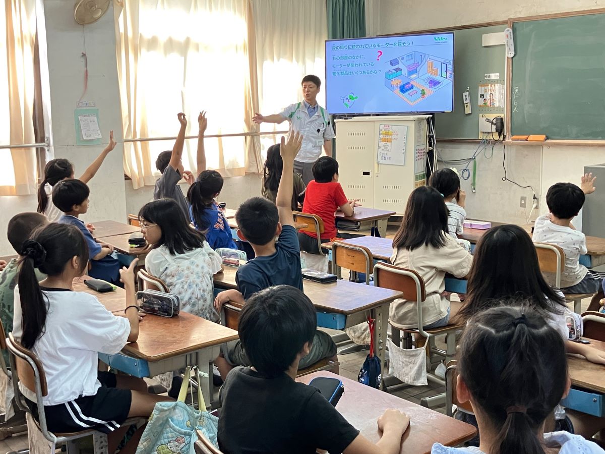子どもたちは授業の中で、家のなかでも街のなかでもモーターが数多く活躍しており、とても身近な存在であることに気付きます。そしてモーターと電気エネルギーとの関係、地球環境への影響について学びます。さらに、当社が地球環境保護のために取り組んでいる省エネモーターについての紹介を行い、子どもたちと一緒に日常生活でできる環境対策を考えます。