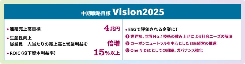 2021年7月に公表した新中期戦略目標「Vision2025」では、新たにESG関連項目を目標として組み込み、ニデックが中長期的に「世界一高性能なモータで地球に貢献する」という使命を果たし、企業価値を拡大し続けていくうえで優先的に取り組むべき重要課題(マテリアリティ)を特定しました。特定したマテリアリティの取り組みテーマごとに設定したKPIを新中期戦略目標「Vision2025」に組み入れ推進することで、当社ビジネスの持続可能性を高めていきます。