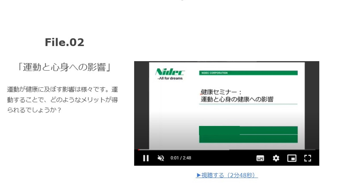 NIDECグループは、社員の健康と働きがいを経営の重要な源泉と位置づけ、「健康経営」の実現に向けた取り組みを推進します。 社員の健康は、本人や家族にとってかけがえのないものです。 また、社員がいきいきと挑戦し、活躍し続けることが、当社が目指す「100年後も持続成長する企業」の実現に繋がると考えます。 社員とその家族とともに次代の社会を支える基盤づくりとして「健康経営」を掲げ、社員一人ひとりが情熱と熱意をもって最高のパフォーマンスを発揮し続ける企業を目指します。
