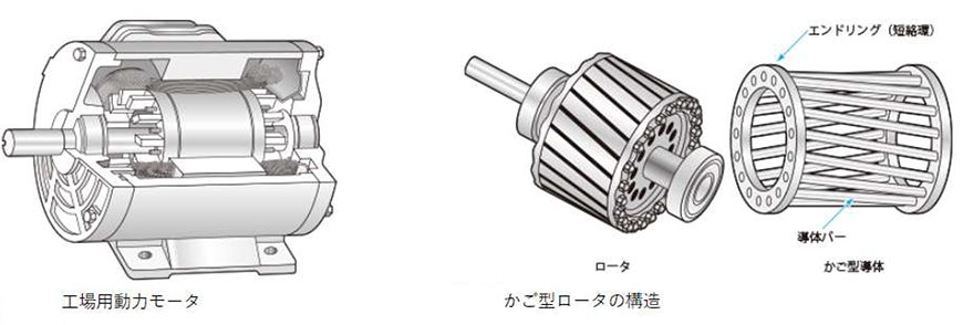 産業用の汎用モータとして19世紀以来長い歴史を有しているのが「かご型誘導機」(非同期モータ)です。商用電源に接続すれば起動することができ、インバータが不要なためシステム全体でのコストを抑えることが可能で、ファンやポンプ、コンプレッサ、クレーン、エレベータなど多くの機器で活用されてきました。しかし、構造上、ロータとステータの間に”すべり”と呼ばれる回転差が生じることから、損失が発生し、モータの効率は後述の同期モータに比べて低いという欠点がありました。