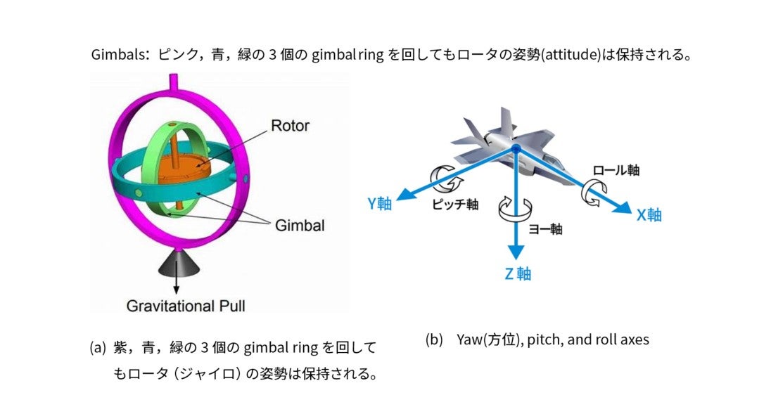 図19-3(a) はジャイロ(Gyroscope)と呼ばれる機構で,ロータは一定の回転速度で回る独楽と思ってよい。慣性モーメントと速度の積が大きいと一定の姿勢を保持しようとする作用が大きい。地面やテーブル上で独楽を回すとわかるのだが,最初は垂直に回っている独楽でも速度が落ちると傾いて歳差運動をする。その原因は地球の重力にある。逆転の発想で,独楽の微細な動きから重力が計算できる。アインシュタインが一般相対性理論を構築したときに,重力と加速度の等価性を見抜いたことを知る読者は多いだろう。この装置を飛行機に搭載すると,次のことがわかる: