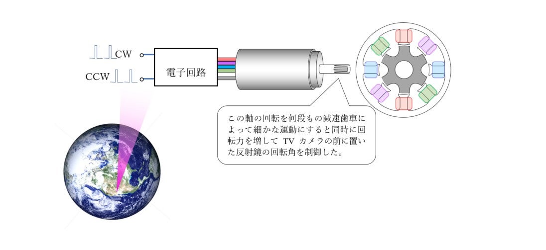 図19-5 に描いたように,ミラーを回転させるステッピング・モータは地球からの電波で操作されました。デジタルのパルス信号でなくてはなりません。江川さんは,航空機用の2相サーボモータを改造してVR型ステッピング・モータを造りだしたのです。固定子と回転子の断面を見ましょう。今,赤の巻線に電流が流れていてステータ鉄心とロータ鉄心の歯が整列しています。電流を緑の巻線にスイッチすると時計方向に15°ステップします。紫の巻線にスイッチすると反時計方向に15°ステップします。