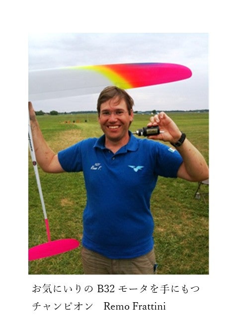 2006年,機械工学と熱力学の専門家である梶信藤教授が職業能力開発総合大学校からNMERLに来られました。筆者は名誉所長に退き彼がNMERL所長となり,この他の企画の補佐的な仕事を遂行しました。F5Bの企画では,私どもが優れたモータを創ってそれを世界に向けて明示するためには,団体戦ではなく個人戦でなくてはいけません。そのためにはドイツとオーストリア以外の欧州チームの有望なプレーヤにNidec モータを提供して,操縦技能を磨いてもらう必要が明らかになりました。このような状況でのキーウ大会での収穫のひとつはスイス生まれでイタリア在住の新人Remo Frattiniと私どものスタッフとの出会いでした。彼がチャンピオンになるまでの物語が長文のletterとして保存されていました。Nidec motorsを使う決心をしたときの彼の心境をここに記します。