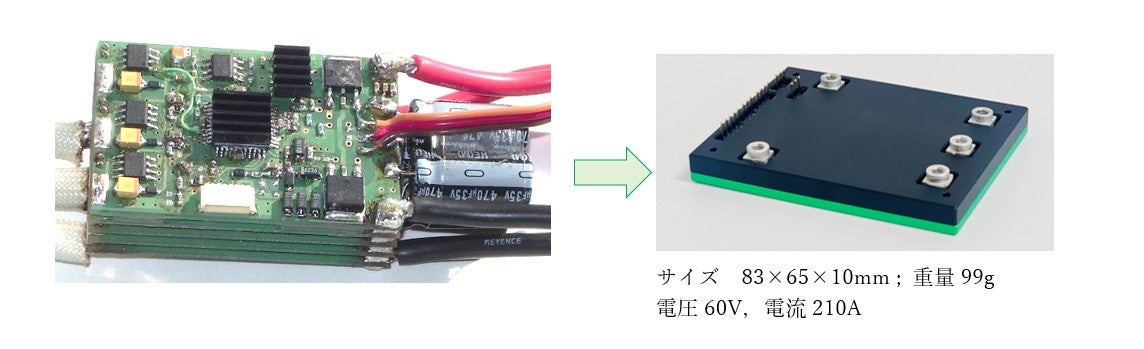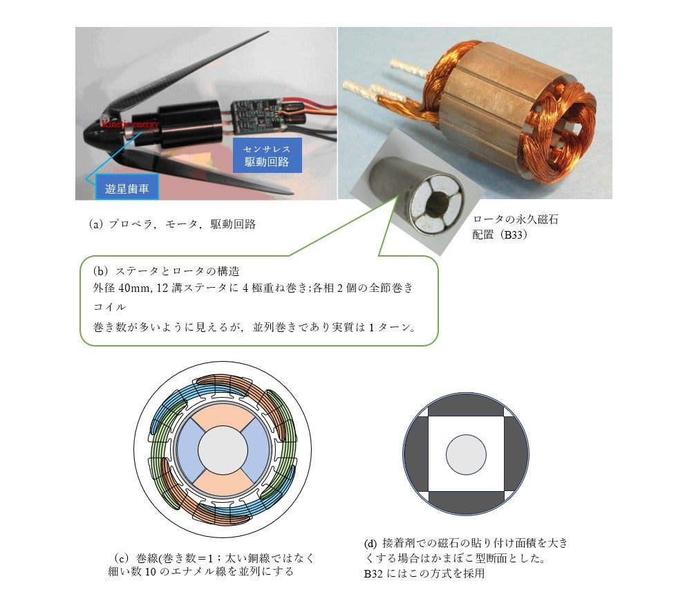 このような小型で強力なモータを製作するには理論計算と工作技術が必要です。ただし,数個のモータや駆動回路の場合には手細工作業の技能も重要でした。狭い空間に構成された駆動回路には300Aもの電流がON/OFF制御されるばかりか,センサレスのための論理信号が行き交うことを知りぬいて,100個に近いMOSFETを配置しハンダ付け作業をして回路制作できる専門家が育成されました。これは電子現象を知り抜いた技術者の知恵の技です。 (MOSFET = Metal-Oxide-Semiconductor Field-Effect Transistor)