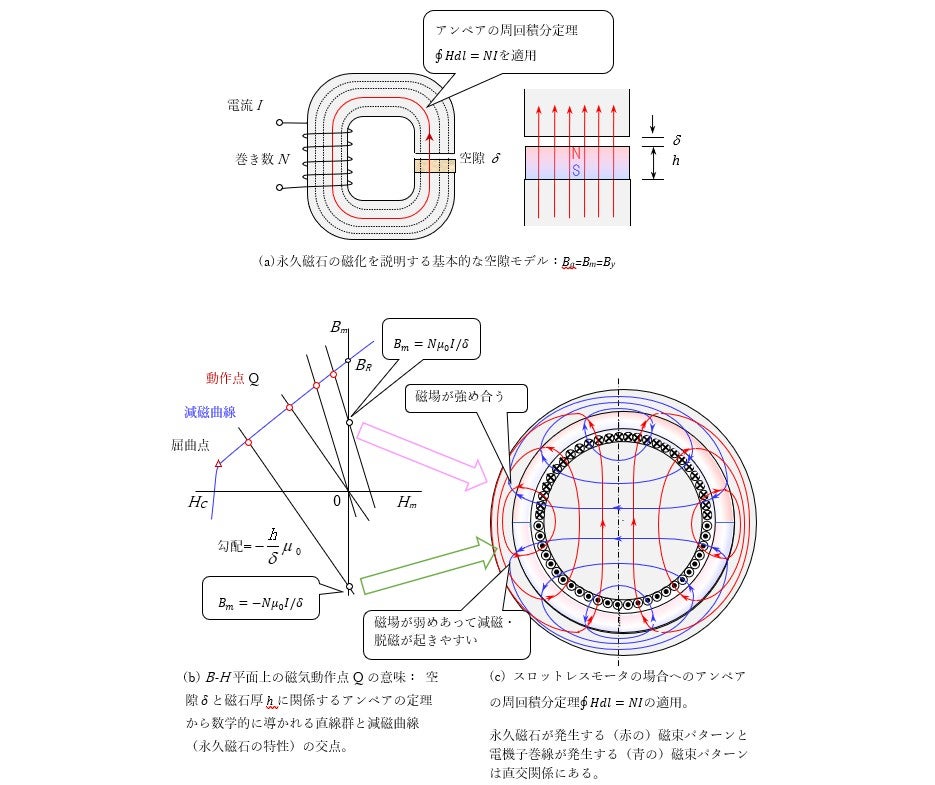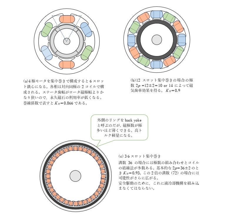 図20-5(a)は磁化された永久磁石の動作点と脱磁を論じるグラフです。ここではC型鉄心の溝に磁石片を置いて巻線の電流で磁化をする基本モデルです。図20-5(b)は12 溝ステータに集中巻きする場合であり,ロータ用永久磁石の極数は12±2=10極あるいは14極であって,いずれもKW ≒ 0.9です。図20-5(c)の36溝の場合にはKW =0.93です。溝数をさらに72とか78に増して80極にすると,KW はさらに1に近づきますが,多極化による負の効果にも用心します。例えば,駆動周波数の増加が鉄損の増加を招きます。