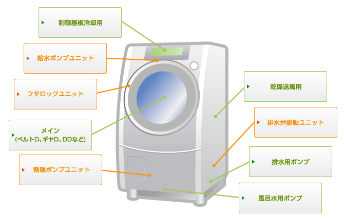 洗濯機におけるモータの代表的な用途はこちら。吹き出しをクリックするとモータの説明が表示されます。